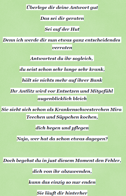 Goldrichtig so, befolge stets das 11., leider allseits verschollene, Gebot, das lautet "Höre auf das Marabellichen!!!"