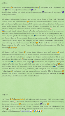 Ich: "Also Mami, wir müssen für den Fall der Fälle gewappnet sein, Priem, Stock, Brille, Gesangbuch😂. Du weißt wenn, dann war es immer spontan, eine kurzfristige Angelegenheit. Deshalb macht er sich auch keine Birne🍐😂. Ich muss dann einfach nur hüpfen🐇 und fragen wie hoch👆 ich springen soll. Aber es geht ja auch nicht anders, hatte ich ihm damals auch gesagt, dass das in Ordnung ist, ausnahmsweise versteht sich😉. Und was ist mit diesem vermaledeiten Datum📆 des 5.6.? Was geschieht da? Geschieht da überhaupt irgendwas? Oder war das allgemeiner Schwachsinn? Muss ich euch vorher noch mal zu unserem Grundstück👉🚗🏡 jagen, bzw. zum Briefkasten💌? Ich weiß nicht ob ich beim nächsten Mal den Hörer📞 abnehmen soll. Denn eigentlich soll man gar nicht rangehen bei diesen Werbeanrufen. Doch wie sollen wir uns sonst verständigen? Viele Möglichkeiten bleiben uns nicht! Das spukt👻 jetzt so in meinem Köpfchen herum. Wenn ich seine Nummer hätte, könnte ich abwägen, ach da gehe ich jetzt ran und dieser Anruf kann mir mal gemütlich den Buckel runterrutschen😂😅😄!"
